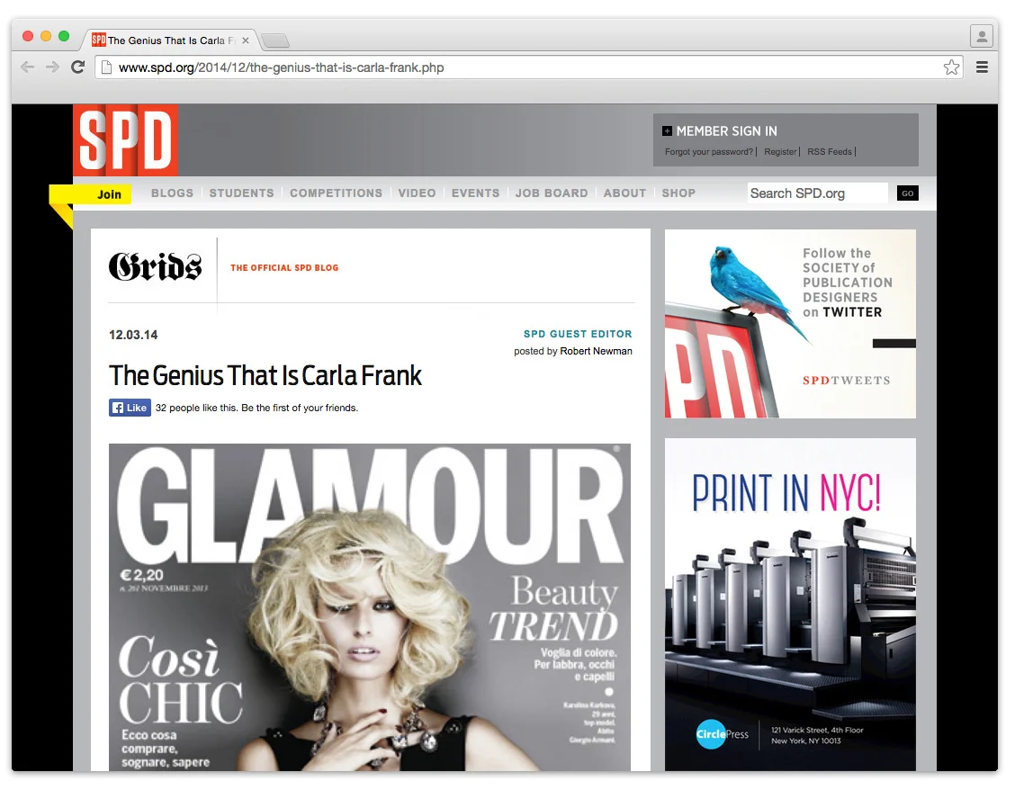 THE GENIUS THAT IS CARLA FRANK IN THE SOCIETY OF PUBLICATION DESIGNERS Read the article by Andy Cowles. Monica JostJanuary 6, 2015 Facebook0 Twitter LinkedIn0 Reddit Tumblr 0 Likes